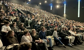 Für über 400 Schülerinnen und Schüler des Berufskollegs des Rhein-Sieg-Kreises in Siegburg verwandelte sich der große Saal des Cineplex Siegburg am vergangenen Donnerstag, 06.11.2025, in ein riesiges Klassenzimmer. Auf dem Stundenplan stand Praxisunterricht im Fach Betriebswirtschaftslehre. Nach einem Jahr Pause konnte das Berufskolleg Nic Lecloux, einen der drei Gründer des erfolgreichen Start Up-Unternehmens true fruits, wieder für einen Vortrag gewinnen. Dank der Unterstützung der Kreissparkasse Köln konnte mit dem Saal im Cineplex ein ausreichend großer Veranstaltungsort gebucht werden. Vor Schülerinnen und Schülern des Beruflichen Gymnasiums und der Höheren Handelsschule informierte Lecloux launig und in für die jungen Zuhörerinnen und Zuhörer verständlicher Sprache über die Entstehung des Bonner Unternehmens, das inzwischen auf eine fast zwanzigjährige Erfolgsgeschichte zurückblicken kann.