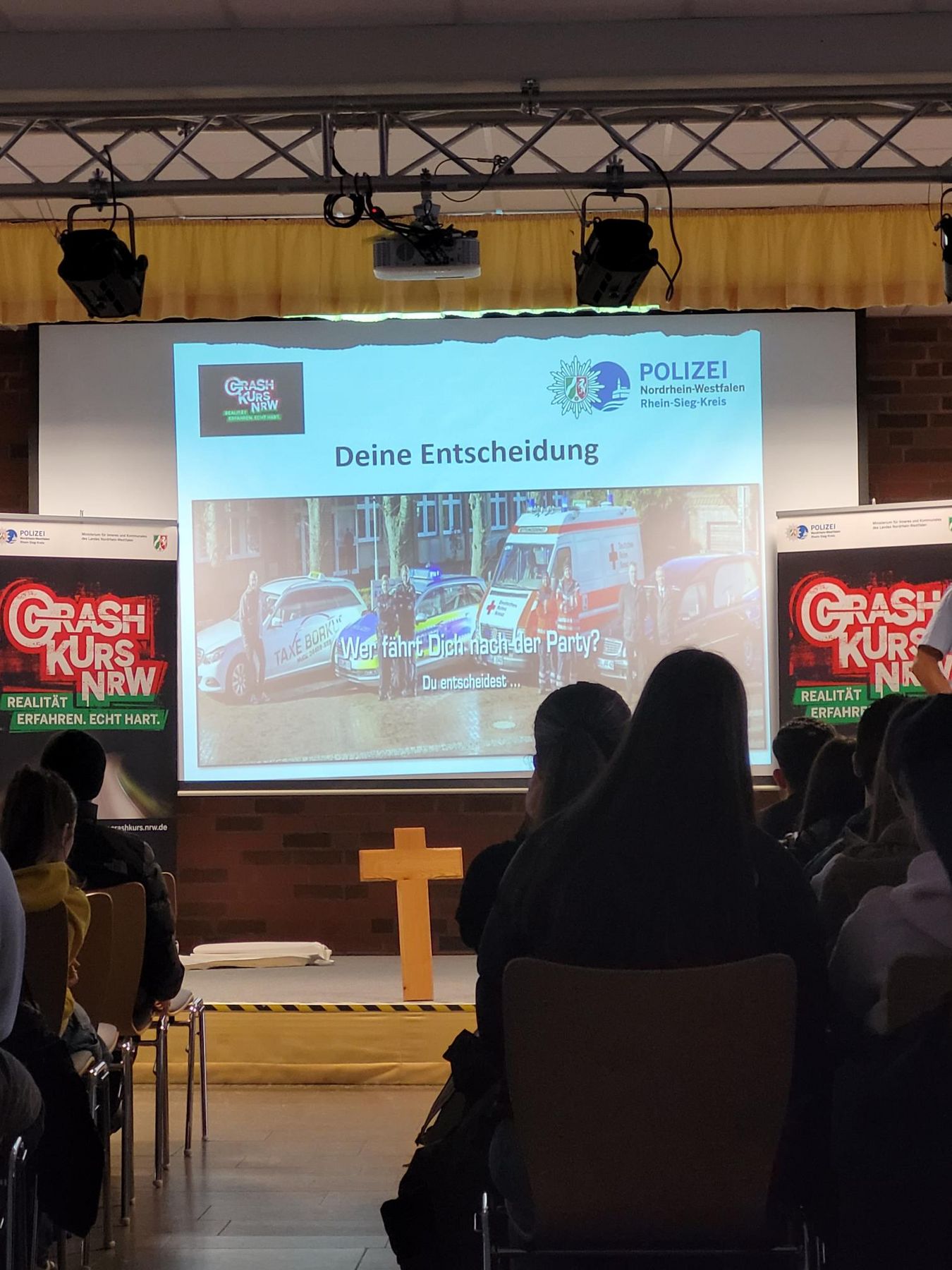 Am Mittwoch vor Karneval füllte sich die Aula gleich zweimal bis auf den letzten Platz: zunächst mit den Schülerinnen und Schülern der Höheren Handelsschule, anschließend mit denen der Handelsschule. Anlass war der Crash-Kurs NRW 2026, ein Präventionsprojekt der Polizei NRW, das junge Menschen mit den realen Folgen riskanten Verhaltens im Straßenverkehr konfrontiert.