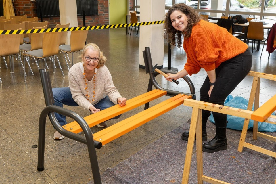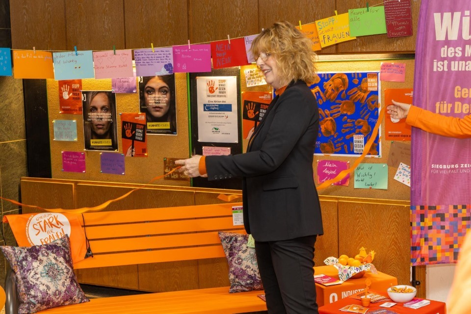 Dafür haben Schülerinnen und Schüler aus unterschiedlichen Bildungsgängen des Berufskollegs wie der Berufsschule, der Höheren Handelsschule oder den Internationalen Förderklassen gemeinsam mit ihren Lehrerinnen eine Bank orange angestrichen. Diese wurde am „Internationalen Tag zur Beseitigung von Gewalt gegen Frauen“ gemeinsam mit Schüler:innen, Lehrer:innen, Schulleiterin Frau Daniela Steffens und der Initiative "Siegburg zeigt Haltung" in der Schule eingeweiht. Mit Informationsmaterialien, Büchern zum Thema und konkreten Telefonnummern und Adressen wie dem bundesweiten Hilfetelefon sollen Betroffene Hilfe und Unterstützung erhalten. Rund um den Orange Day wurde das Thema im Unterricht und in den Pausen weiter intensiv besprochen und mit interessierten Schüler:innen über die Problematik physischer, psychischer und zunehmender digitaler Gewalt diskutiert. Die orange Bank soll ein starkes Zeichen setzen und zeigen: Wir schauen hin und wenden uns nicht ab, wenn Menschen Gewalt angetan wird.
